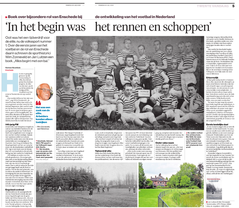 Zonneveld, oud-hoogleraar Engels en auteur van meerdere boeken over de sportgeschiedenis van Nederland, heeft zich uitgebreid in de vroege jaren van het voetbal verdiept. Samen met sportjournalist Jan Luitzen schreef hij onder meer over de eerste wedstrijden en verenigingen in Haarlem, Den Haag en Zeeland. Nu, bij gelegenheid van het 140-jarig bestaan van de Enschedese voetbalclub PW, ligt er een boek over de bijzondere rol van Enschede in de ontwikkeling van het voetbal in Nederland.